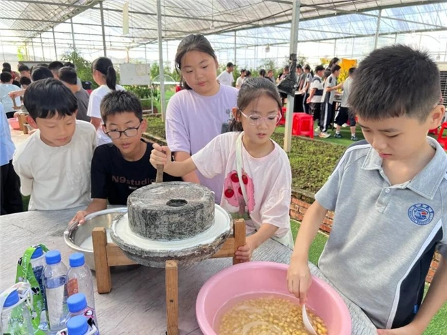 谈到实践教育中的难忘瞬间,何楼的眼睛亮了起来。她详细分享了去年仙居生态园4天3夜的劳动实践活动:孩子们从事农事劳作,割稻、拔草挣工分比赛,参与“菜棚子、菜篮子、菜摊子、菜盘子”系列实践,体验黄豆大变身的全过程,创设模拟传统集市,最后小组合作完成一桌菜肴。